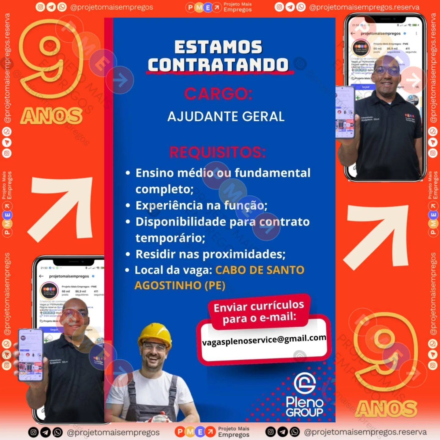 Benefícios: AUXILIAR DE LOGÍSTICA: convênios, plano de saúde, seguro de vida, vale-alimentação, vale-transporte; TÉCNICO(A) DE SEGURANCA DO TRABALHO: day off de aniversário, plano de saúde, plano odontológico, refeição no local, seguro de vida, vale-alimentação, vale-transporte; AJUDANTE GERAL: vale-alimentação, vale-transporte