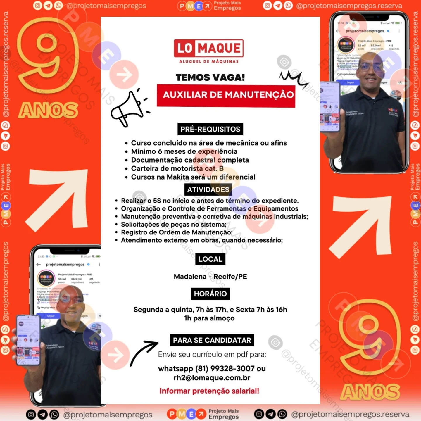 As informações sobre a vaga de emprego, como salário, remuneração, benefícios, requisitos, local de trabalho, forma de candidatura (e-mail ou whatsapp para enviar seu currículo) etc., estarão na imagem acima, caso estejam disponíveis.