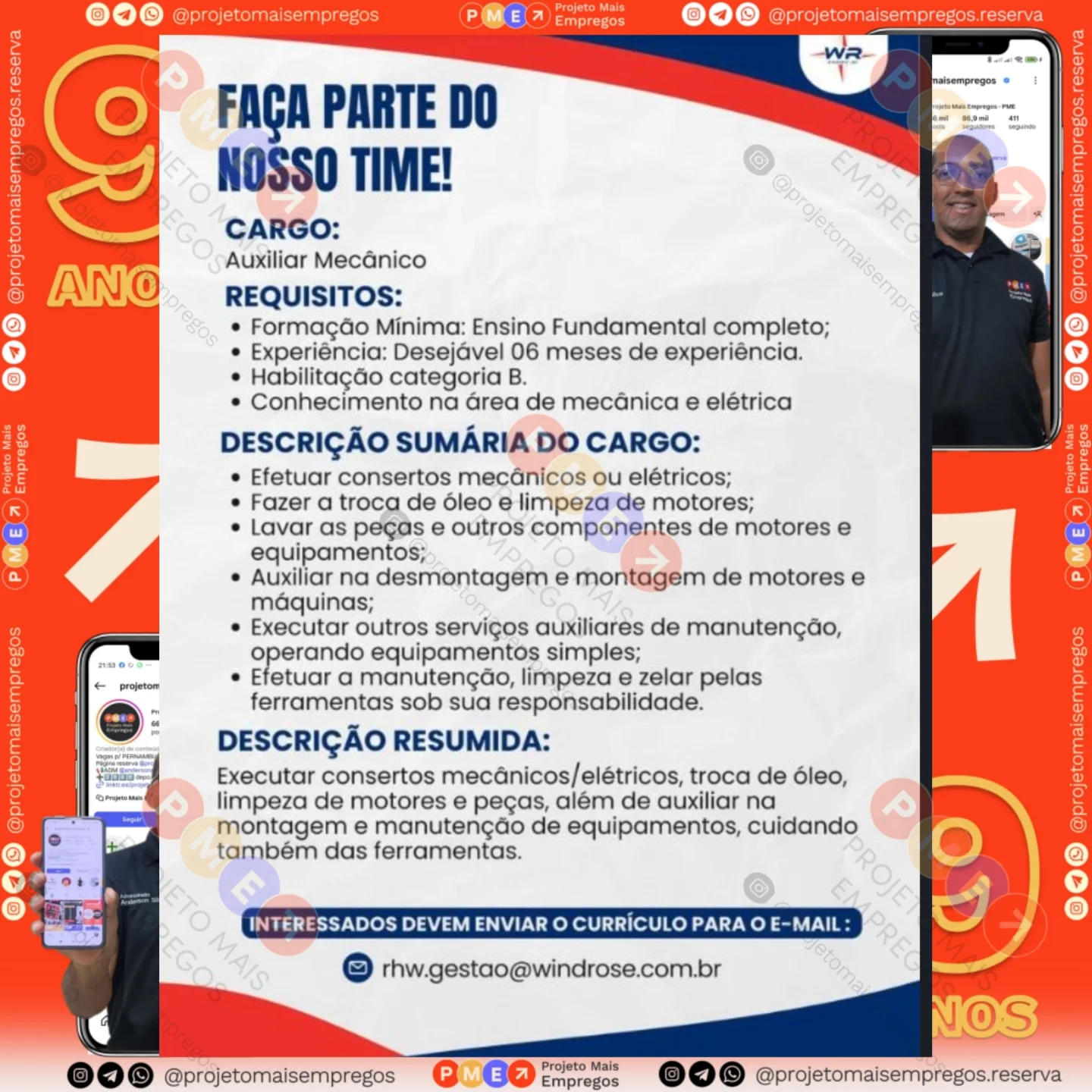 As informações sobre a vaga de emprego, como salário, remuneração, benefícios, requisitos, local de trabalho, forma de candidatura (e-mail ou whatsapp para enviar seu currículo) etc., estarão na imagem acima, caso estejam disponíveis.