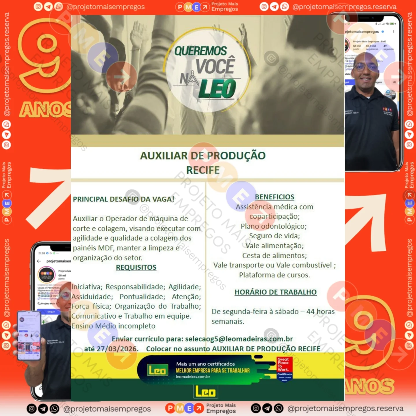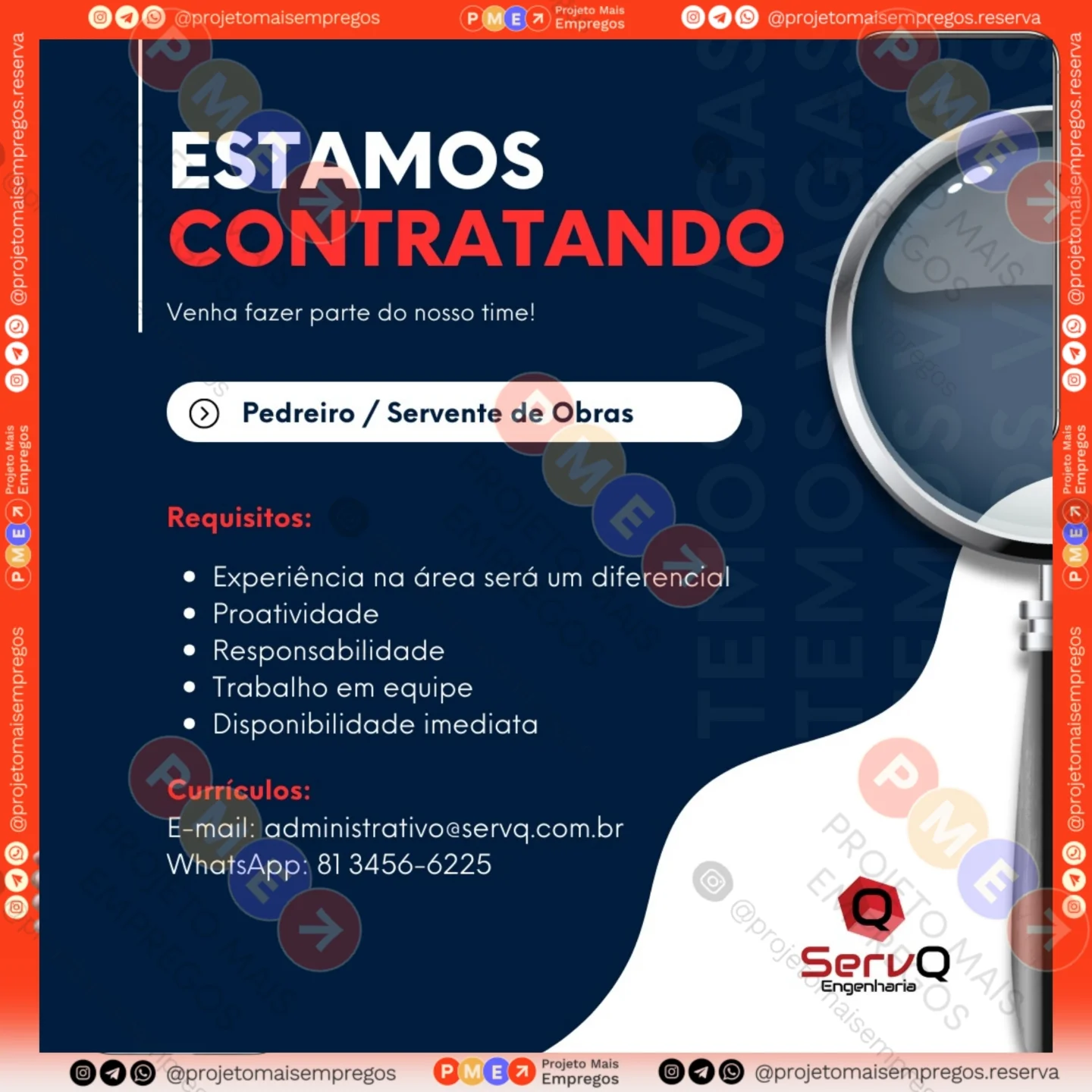 8 Vagas de emprego para Auxiliar De Produção, Auxiliar De Logística, Pedreiro / Servente, Técnico(A) De Seguranca Do Trabalho em Pernambuco nesta sexta-feira (27/03)