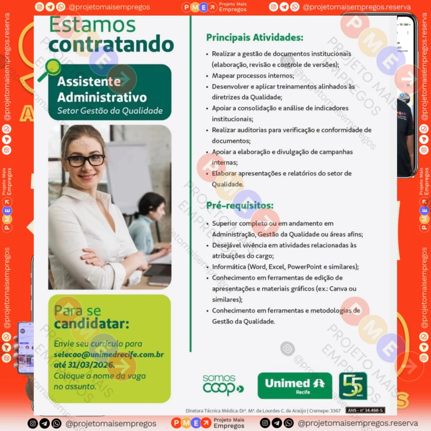 As informações sobre a vaga de emprego, como salário, remuneração, benefícios, requisitos, local de trabalho, forma de candidatura (e-mail ou whatsapp para enviar seu currículo) etc., estarão na imagem acima, caso estejam disponíveis.