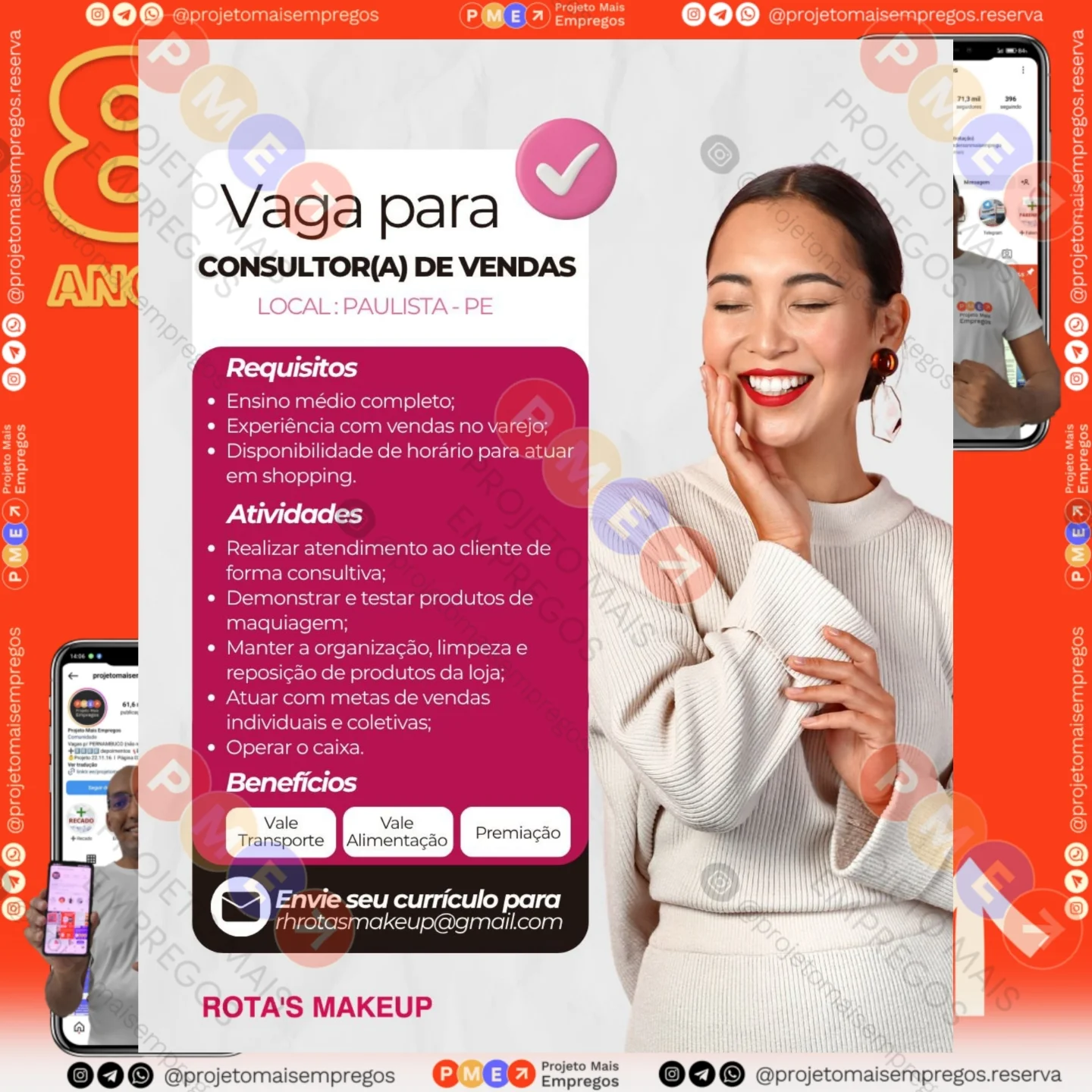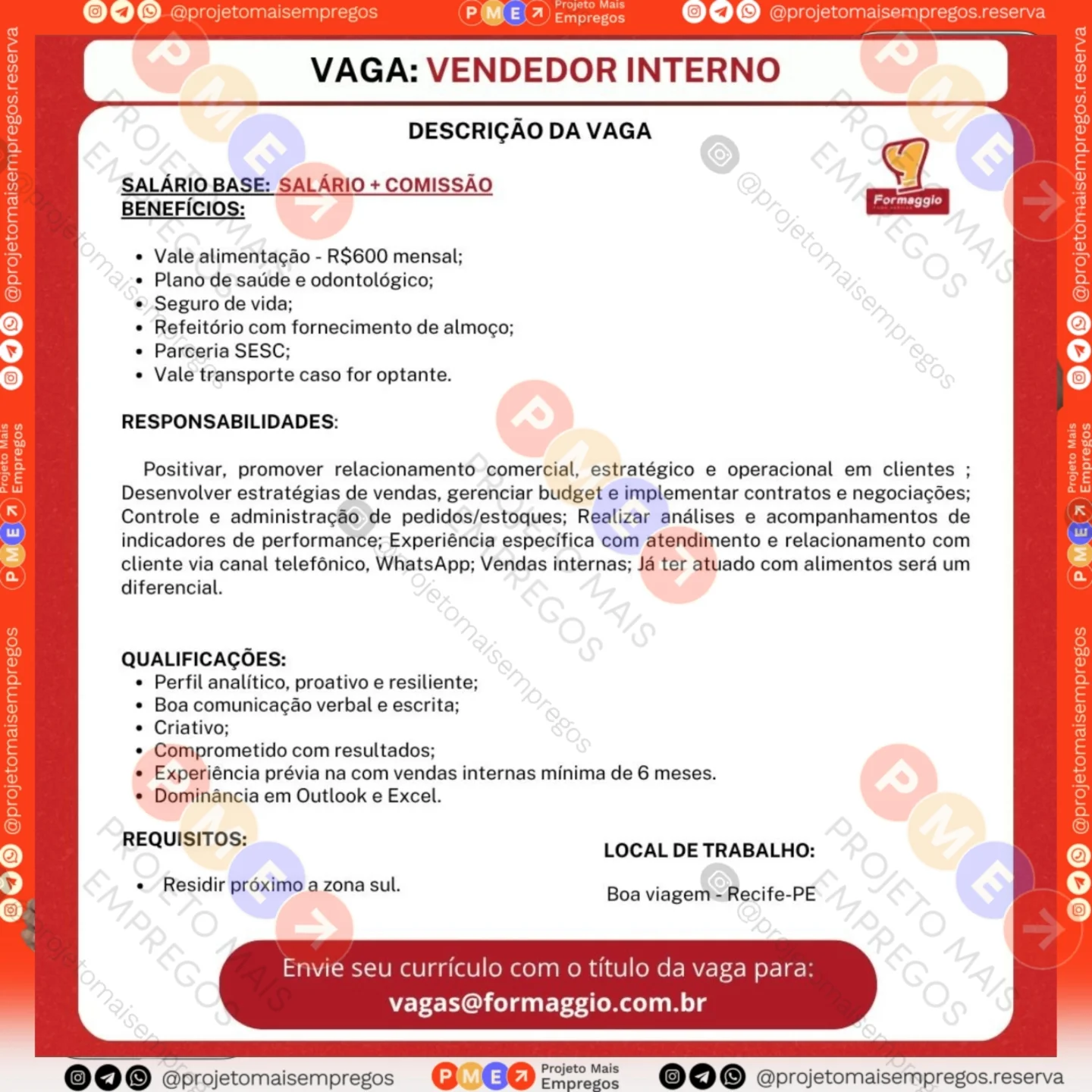 As informações sobre a vaga de emprego, como salário, remuneração, benefícios, requisitos, local de trabalho, forma de candidatura (e-mail ou whatsapp para enviar seu currículo) etc., estarão na imagem acima, caso estejam disponíveis.