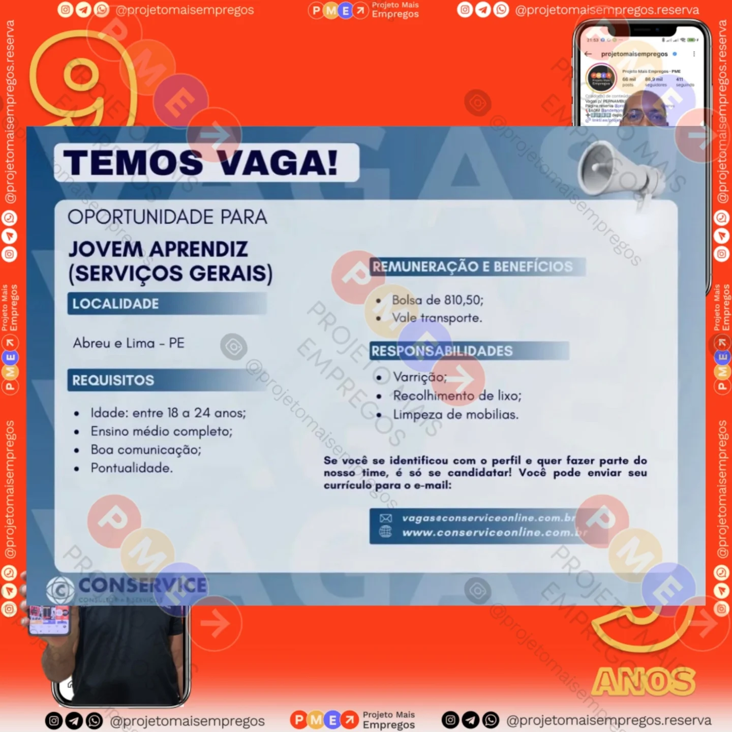 Benefícios: JOVEM APRENDIZ: bonificação/premiação, day off de aniversário, licença-maternidade, plano odontológico, seguro de vida, vale-alimentação, vale-transporte; AUXILIAR DE SERVIÇOS GERAIS / LIMPEZA: vale-alimentação, vale-transporte